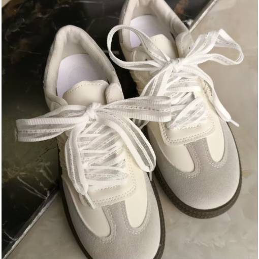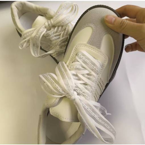 Kombinácia bielej farby s jemnými zlatými a priehľadnými prúžkami pôsobí elegantne, moderne a dodáva obuvi originálny vzhľad.